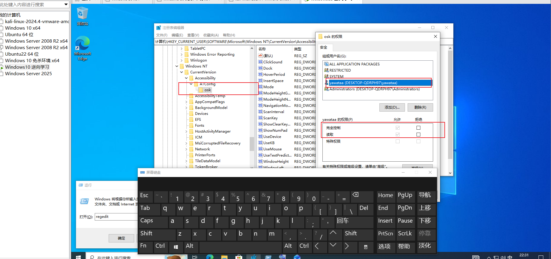 最后,启动一个以 SYSTEM 名义运行的 osk.exe 进程实例,并复制 以下值HKU\.DEFAULT\Software\Microsoft\Windows NT\CurrentVersion\Accessibility\ATConfig\osk