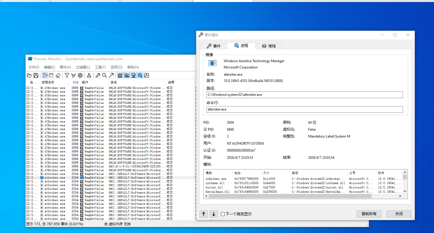 作为SYSTEM账户运行的ATbroker.exe进程将继续复制HKLM\SOFTWARE\Microsoft\Windows NT\CurrentVersion\Accessibility\Session1\ATConfig\osk