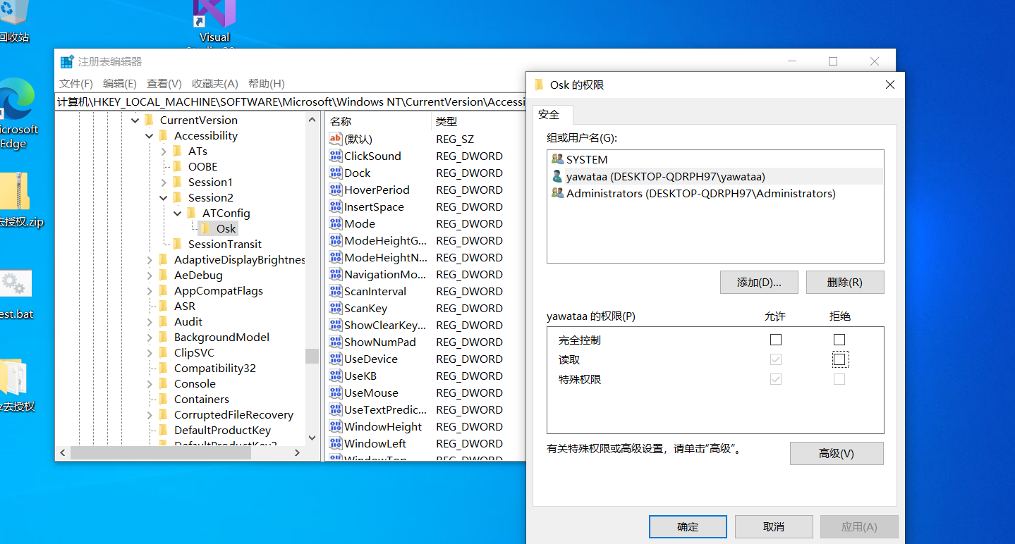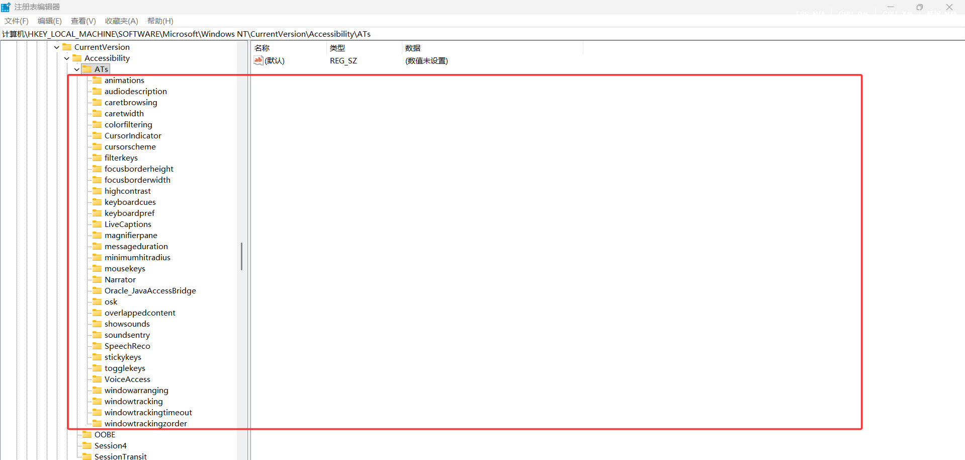 HKEY_CURRENT_USER\SOFTWARE\Microsoft\Windows NT\CurrentVersion\Accessibility\ATConfig\<accessibility feature name>当用户启用某个辅助功能(如屏幕键盘)时,Windows 会在注册表中创建相应的配置项来保存该功能的设置。
